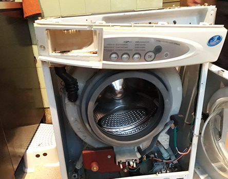 Клиент обратился в сервис "ClickRemont" с жалобой на сильную вибрацию и шум при отжиме. Также отмечалось, что стиральная машина периодически выдает ошибку "UE" и останавливает цикл стирки.